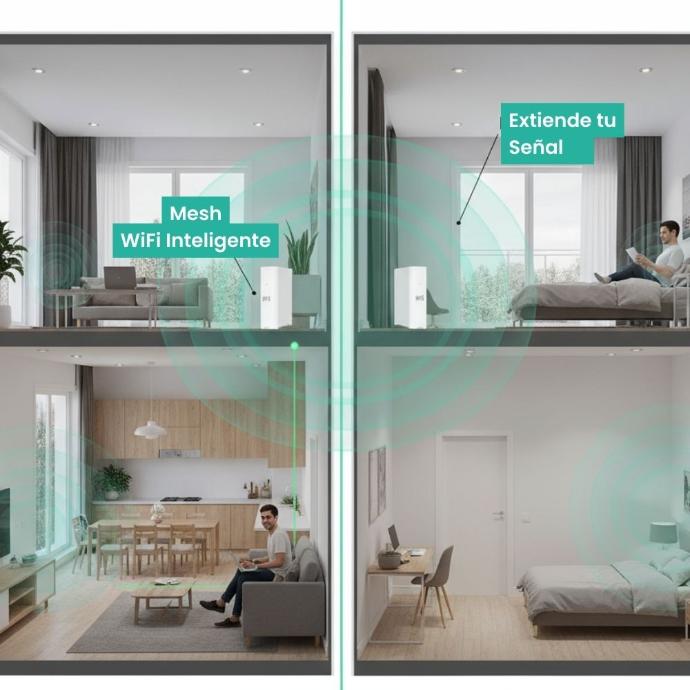Elimina las zonas muertas, navega a toda velocidad y conecta hasta 128 dispositivos sin interrupciones. Este sistema crea una malla inteligente que cubre cada rincón de tu hogar (120mts por dispositivo), permitiéndote caminar de la sala a la habitación sin que se caiga la señal. Es internet rápido, estable y sin enredos.